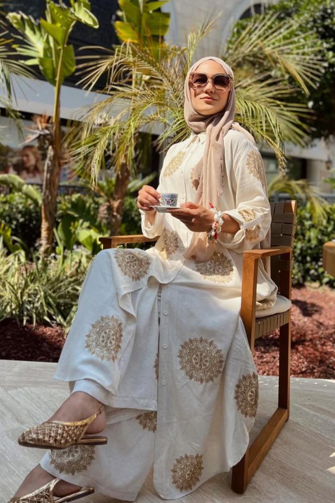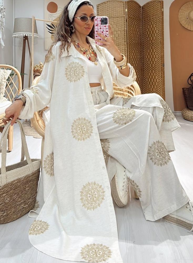 طقم عصري وأنيق، مصنوع من القطن التركي الخفيف والبارد، مزيّن بتطريز ذهبي فاخر يضفي لمسة فخمة وراقية. مؤلف من قطعتين: بلوزة مريحة وبنطلون واسع، بقصة عصرية تضمن لكِ إطلالة عملية وأنيقة في نفس الوقت