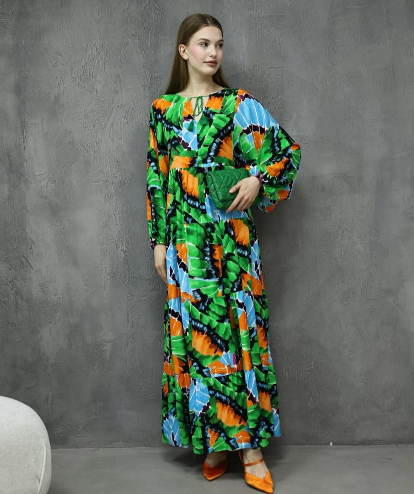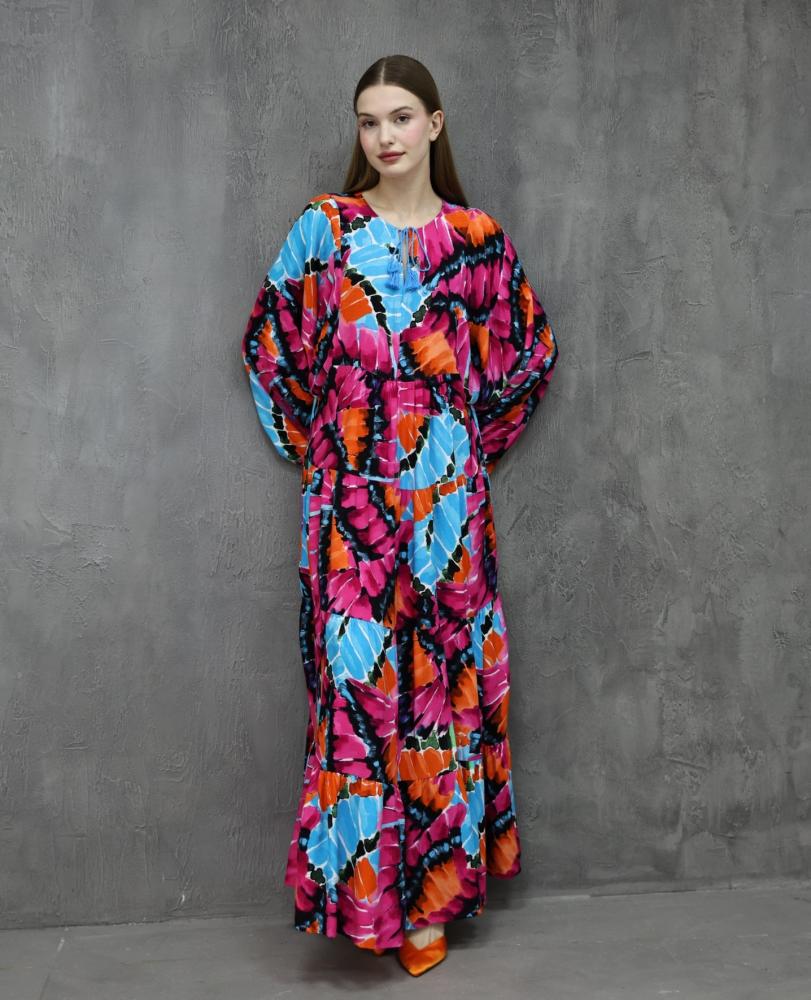 فستان طويل بتصميم فضفاض وألوان مفرفشة تجمع بين البنفسجي والبرتقالي والزهري