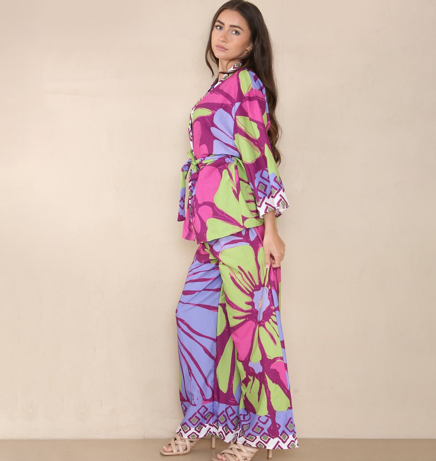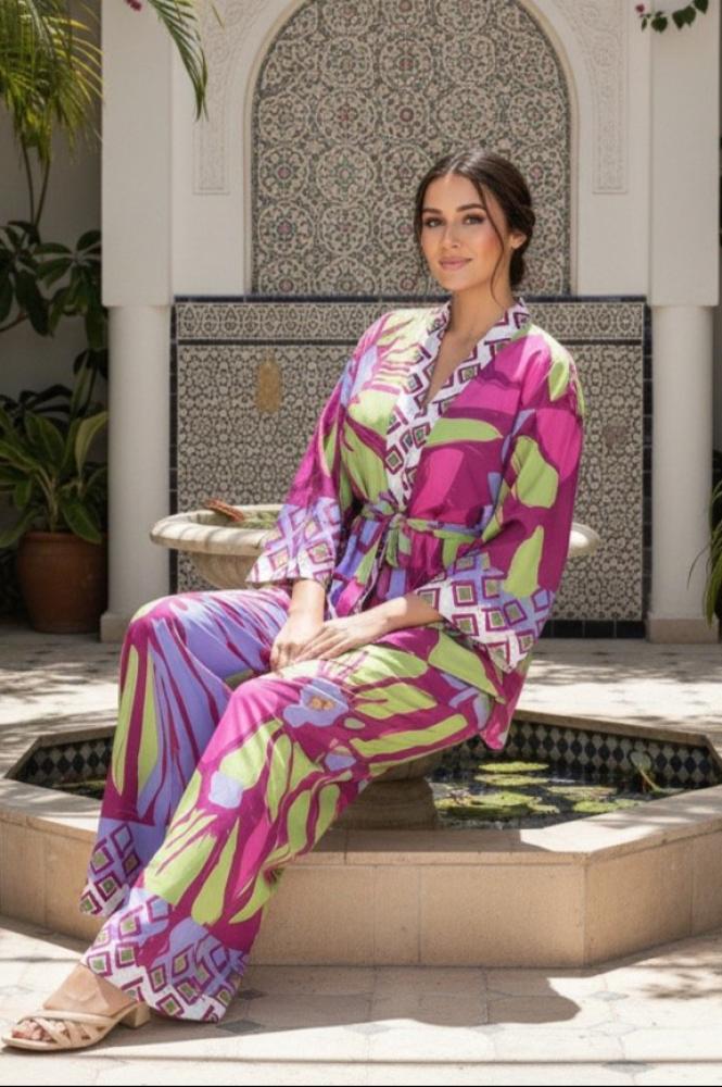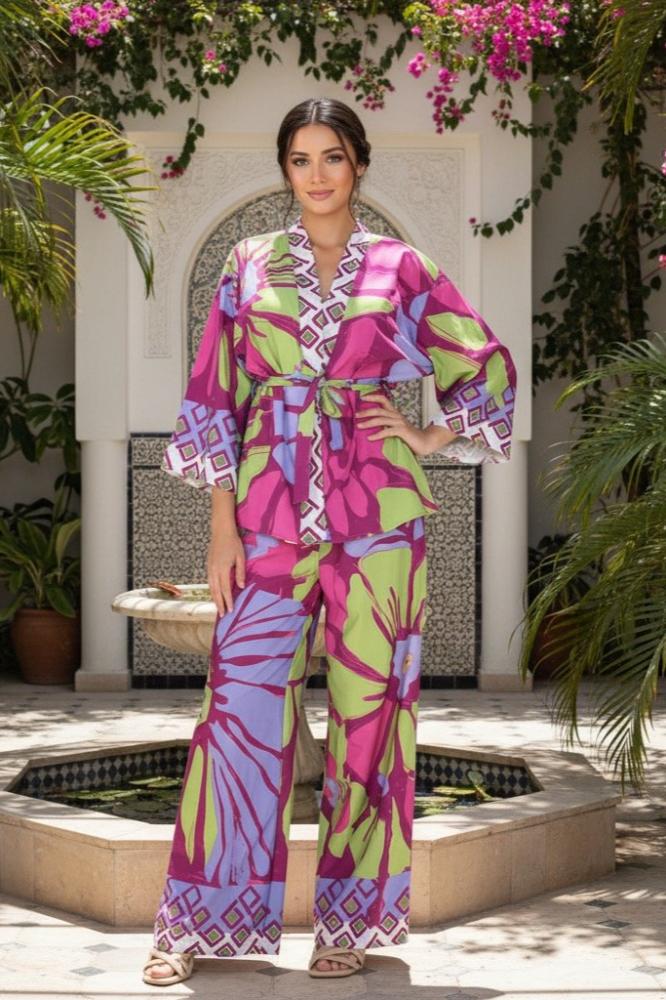الطقم ذا الألوان الصيفية الأنيقة بالاضافة لحزام ساتان من نفس ألوانه